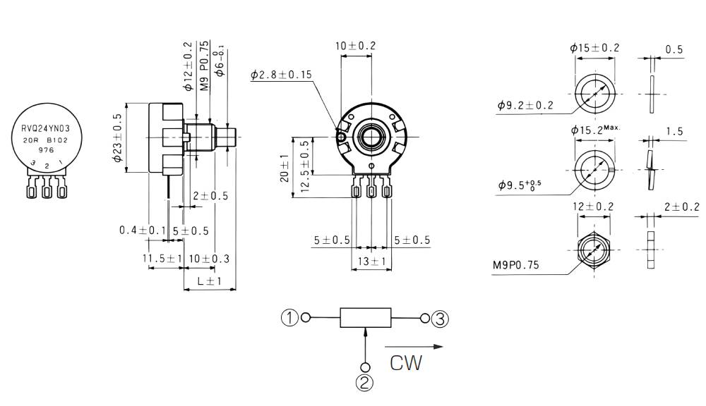 RVQ24YN03 25F(20F 20S)單圈碳膜電位器25F代表軸長25mm半軸,20F代表軸長20mm半軸,S是圓軸軸直徑:6mm