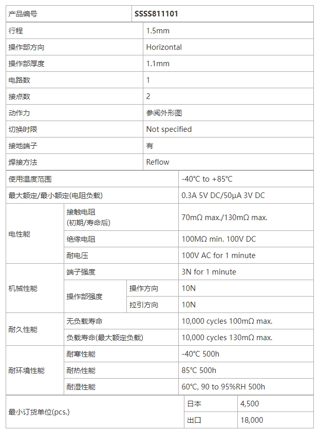 絕緣電阻:100MΩ min. 100V DC;耐電壓:100V AC for 1 minute
