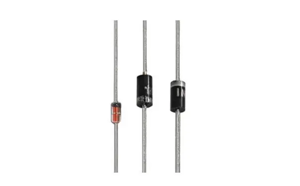 點(diǎn)接觸型二極管是由一根根細(xì)的金屬絲熱壓在半導(dǎo)體薄片上制成的。在熱壓處理過程中,半導(dǎo)體薄片與金屬絲接觸面上形成了一個(gè)PN結(jié),金屬絲為正極,半導(dǎo)體薄片為負(fù)極。